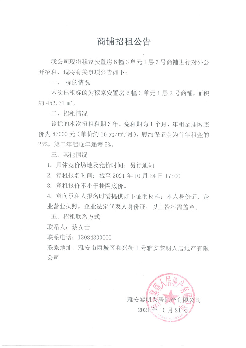 穆家安置房6幢1層3號招租公告
