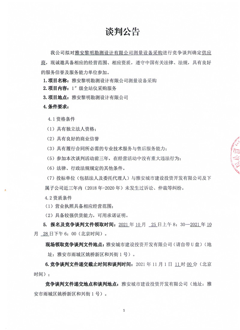 雅安黎明勘測(cè)設(shè)計(jì)有限公司測(cè)量設(shè)備采購(gòu)競(jìng)爭(zhēng)性談判公告