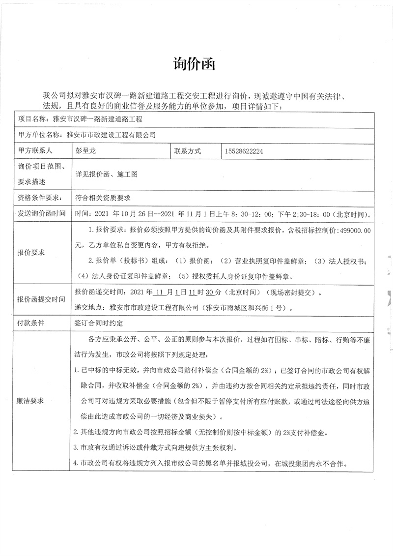 雅安市漢碑一路新建道路工程交安工程詢價函
