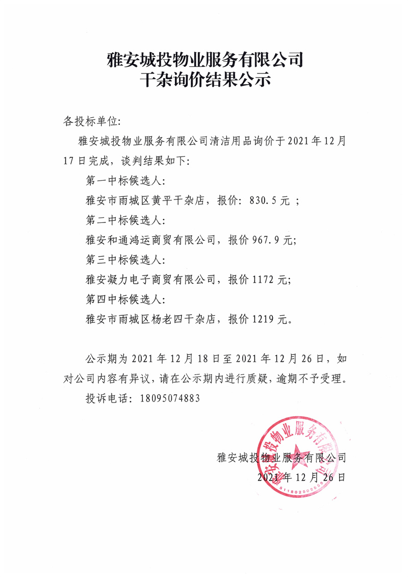 雅安城投物業(yè)服務(wù)有限公司食堂干雜詢價結(jié)果公示