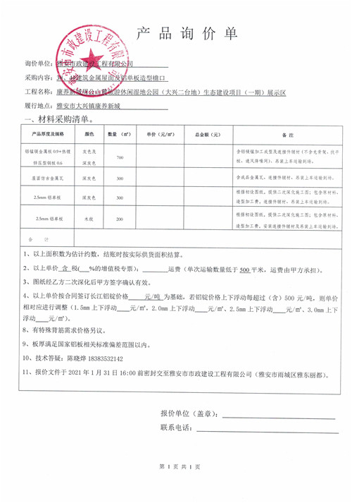 雅安市政建設(shè)工程有限公司康養(yǎng)新城周公山麓旅游休閑濕地公園(大興二臺地)生態(tài)建設(shè)項目(一期)展示區(qū)3#、4#建筑金屬屋面及鋁單板造型檐口產(chǎn)品詢價單