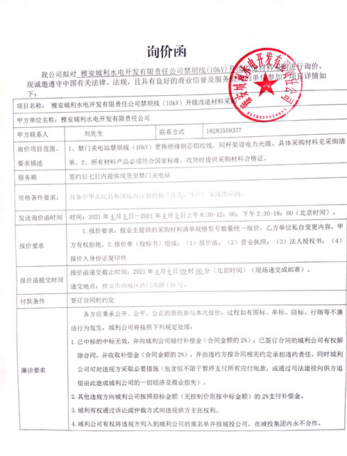 雅安城利水電開發(fā)有限責任公司禁壩線(10kv)升級改造材料采購詢價函