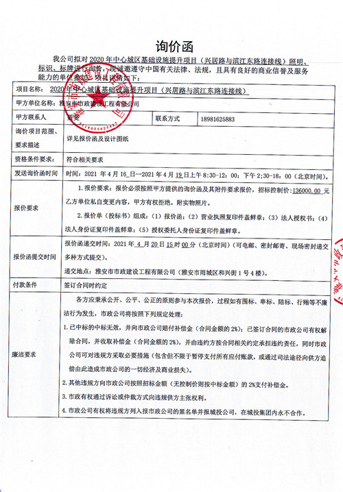 雅安市政公司2020年中心城區(qū)基礎(chǔ)設(shè)施提升項(xiàng)目(興居路與濱江東路連接線)照明、標(biāo)識(shí)、標(biāo)牌詢價(jià)函