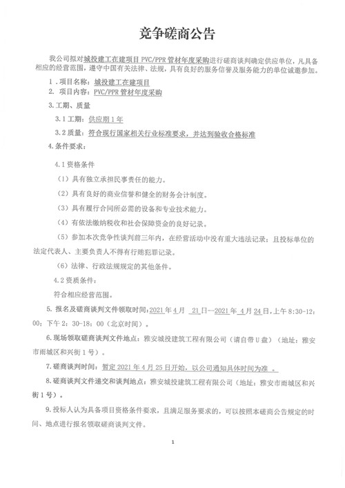 城投建工在建項(xiàng)目PVC/PPR管材年度采購(gòu)磋商公告