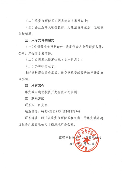 雅安城投房地產(chǎn)開發(fā)有限公司關(guān)于邀請房地產(chǎn)中介公司入庫的公告