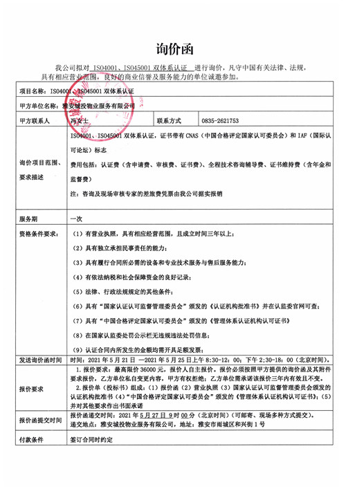 城投物業(yè)IS04001、IS045001雙體系認證詢價函