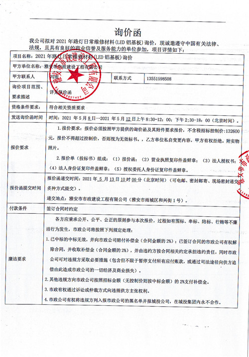 2021年路燈日常維修材料(LED鋁基板)詢價函