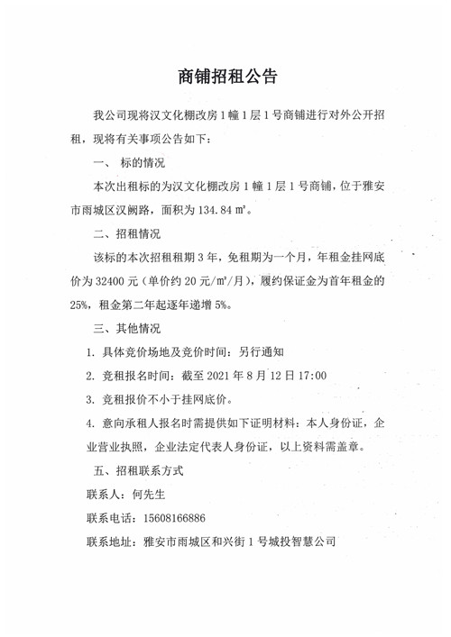 城投智慧公司漢文化棚改房1幢1層1號商鋪招租公告