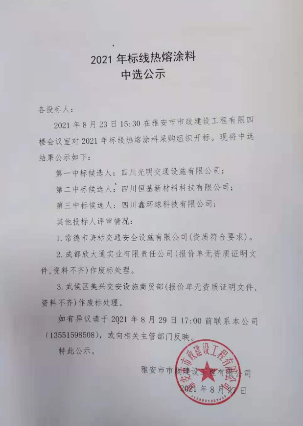 市政公司2021年標線熱熔涂料詢價結果公示