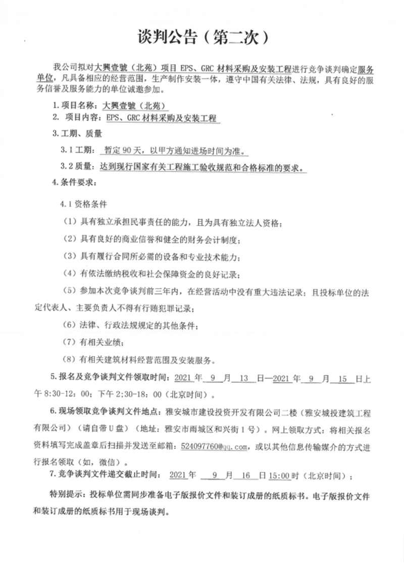 大興壹號(北苑)項(xiàng)目EPS、GRC材料采購及安裝工程競爭談判公告(第二次)