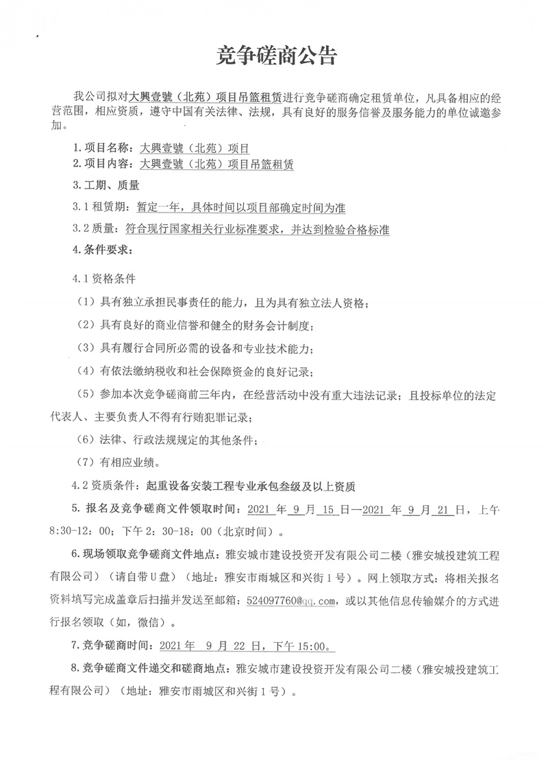 大興壹號(hào)(北苑)項(xiàng)目吊籃租賃競(jìng)爭(zhēng)性磋商公告