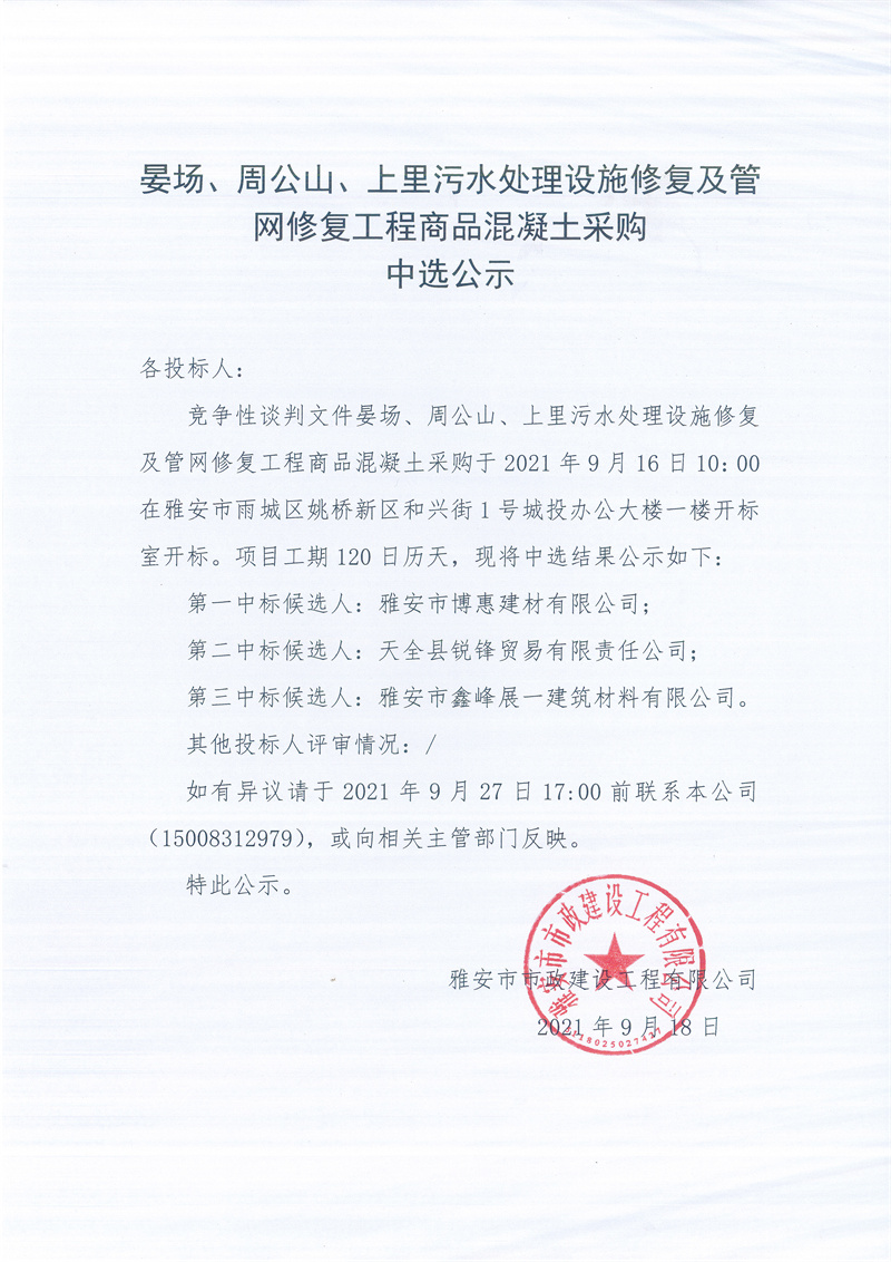 晏場(chǎng)、周公山、上里污水處理設(shè)施修復(fù)及管網(wǎng)修復(fù)工程商品混凝土采購(gòu)競(jìng)爭(zhēng)性談判結(jié)果公示