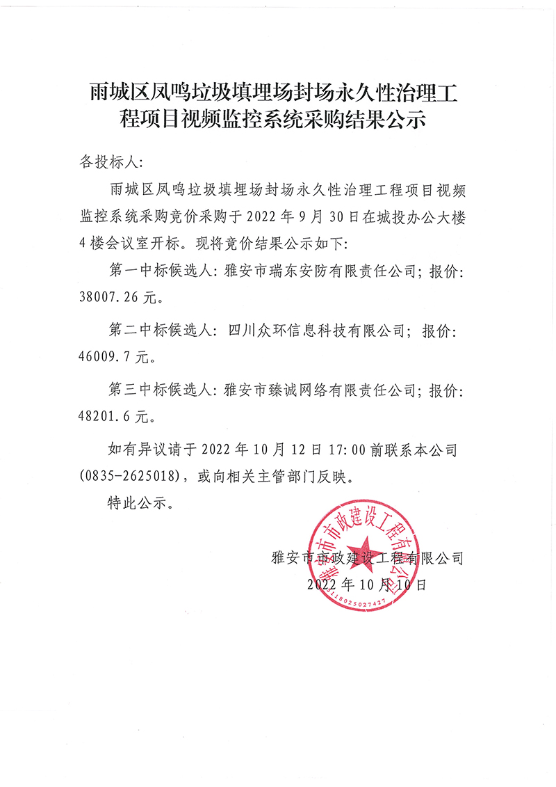 雨城區(qū)鳳鳴垃圾填埋場(chǎng)永久性封場(chǎng)治理工程項(xiàng)目視頻監(jiān)控系統(tǒng)采購(gòu)結(jié)果公示