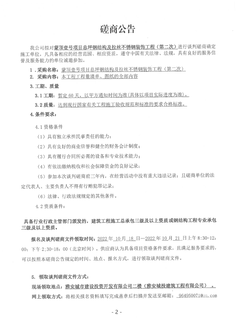 蒙頂壹號(hào)項(xiàng)目總坪鋼結(jié)構(gòu)及拉絲不銹鋼裝飾工程(第二次)談判磋商公告