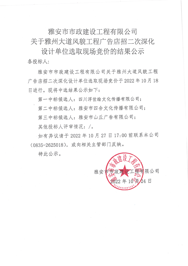 雅安市市政建設工程有限公司關于雅州大道風貌工程廣告店招二次深化設計單位選取現(xiàn)場競價的結(jié)果公示