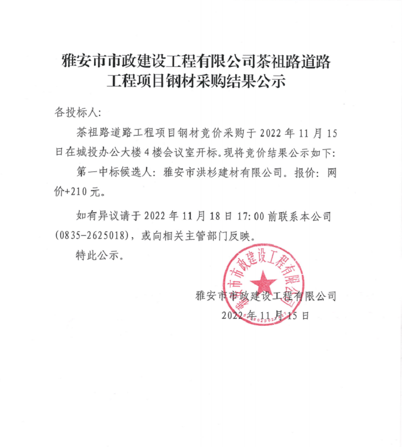 雅安市市政建設(shè)工程有限公司茶祖路道路工程項(xiàng)目鋼材采購結(jié)果公示