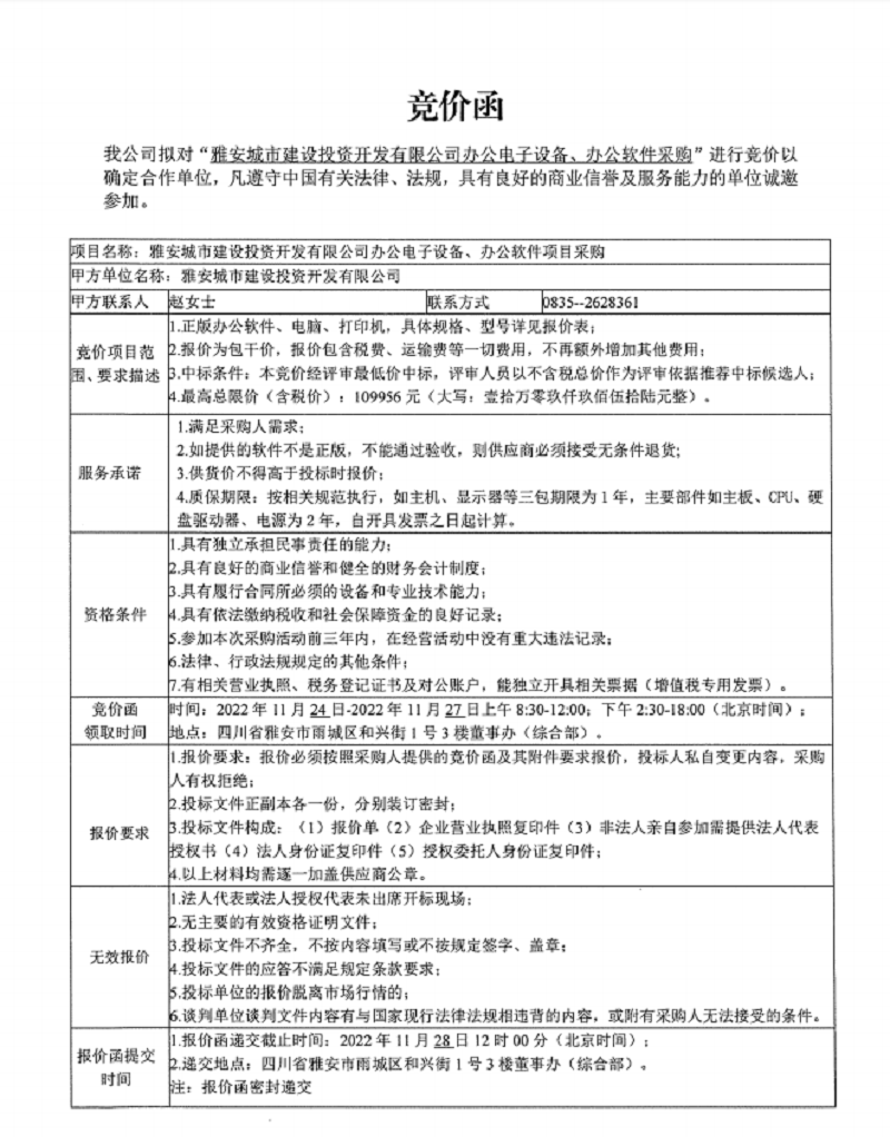 雅安城市建設(shè)投資開發(fā)有限公司辦公電子設(shè)備、辦公軟件項(xiàng)目采購競價(jià)公告