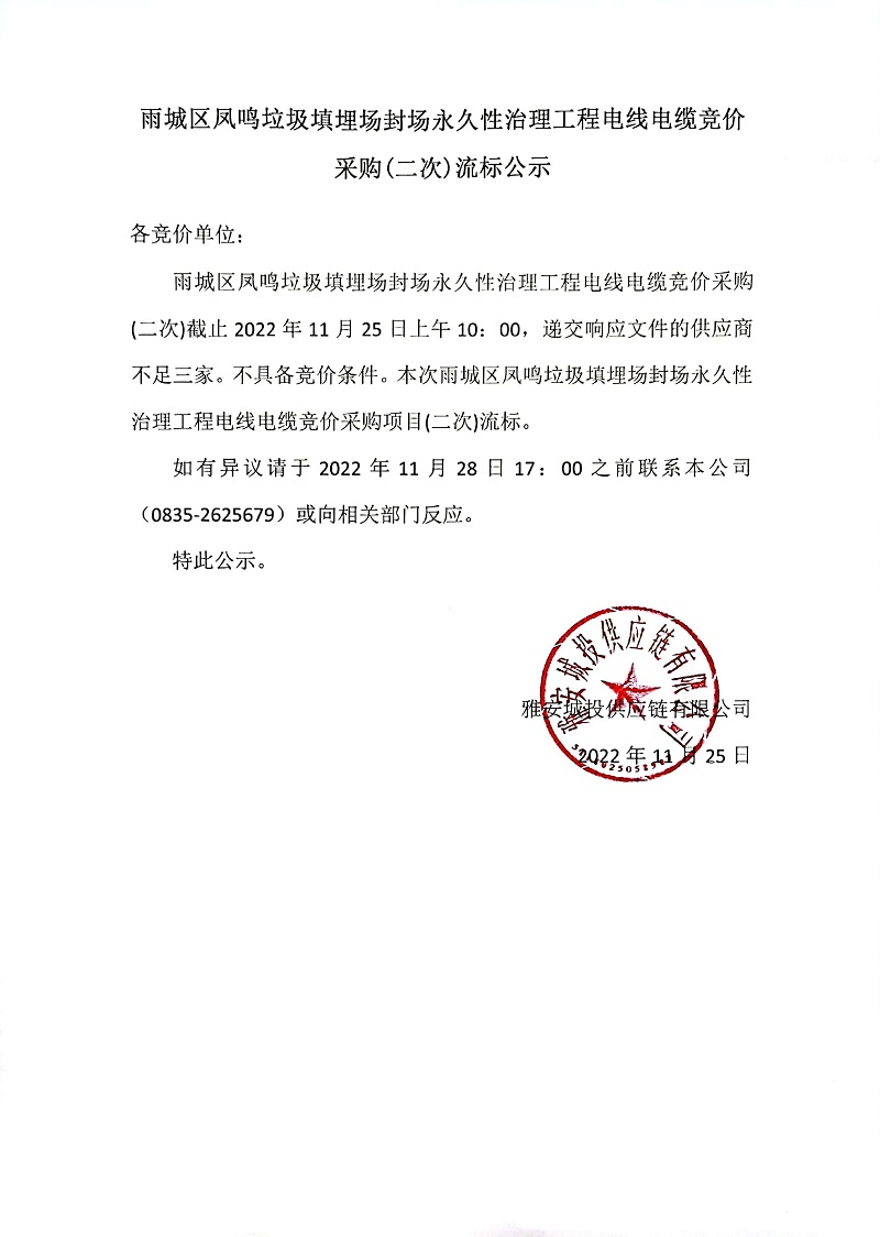 雨城區(qū)鳳鳴垃圾填埋場封場永久性治理工程電線電纜競價采購(二次)流標公示