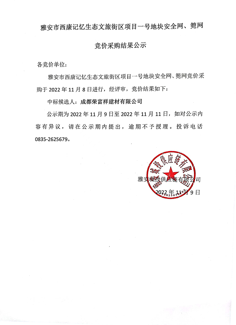 雅安市西康記憶生態(tài)文旅街區(qū)項目一號地塊安全網(wǎng)、篼網(wǎng)材料采購競價結(jié)果公示