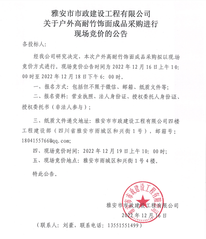 雅安市市政建設工程有限公司關于戶外高耐竹飾面成品采購進行現場競價公告