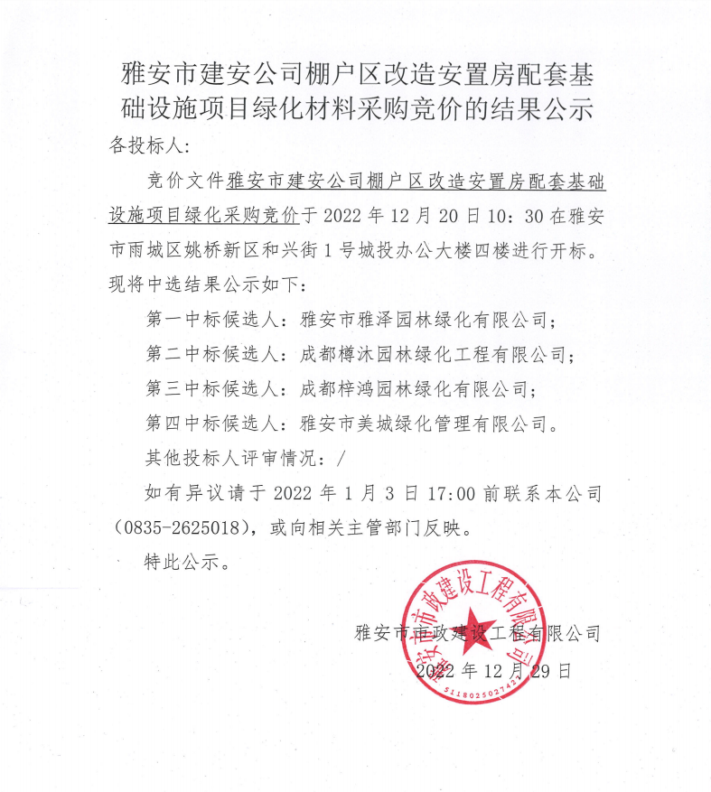 雅安市建安公司棚戶區(qū)改造安置房配套基礎設施項目綠化材料采購競價結果公示