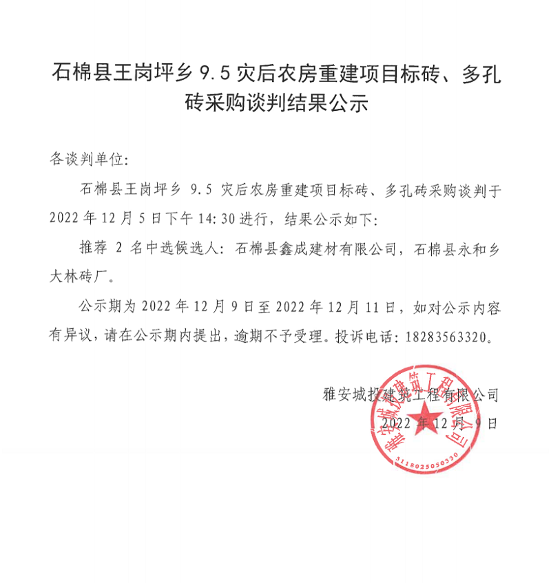 石棉縣王崗坪鄉(xiāng)9.5災后農(nóng)房重建項目標磚、多孔磚采購談判結果公示