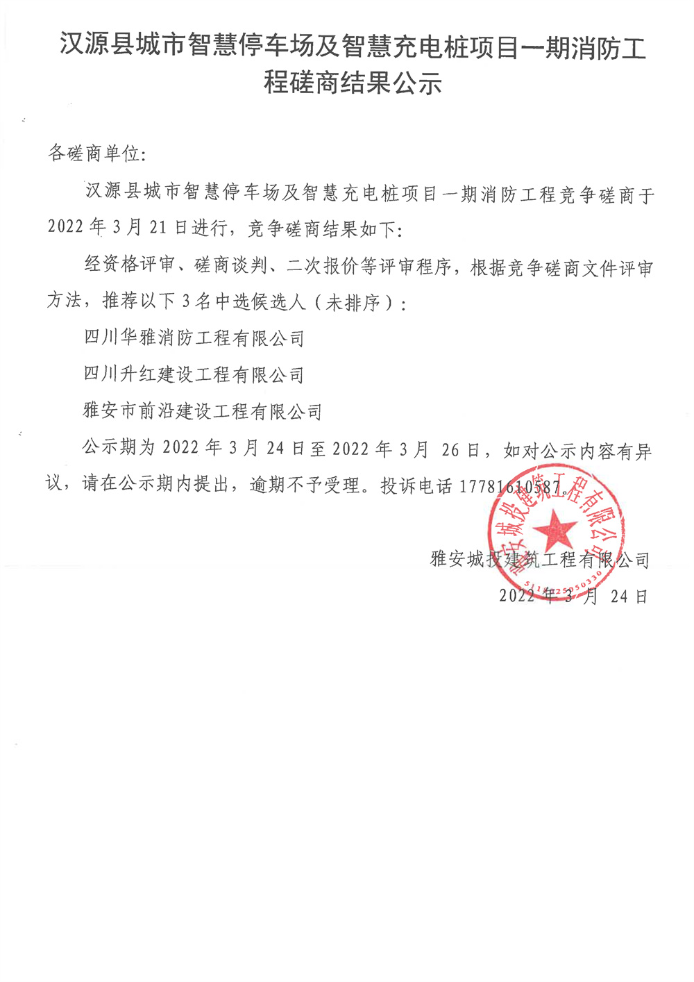 漢源縣城市智慧停車場(chǎng)及智慧充電樁項(xiàng)目一期消防工程磋商結(jié)果公示