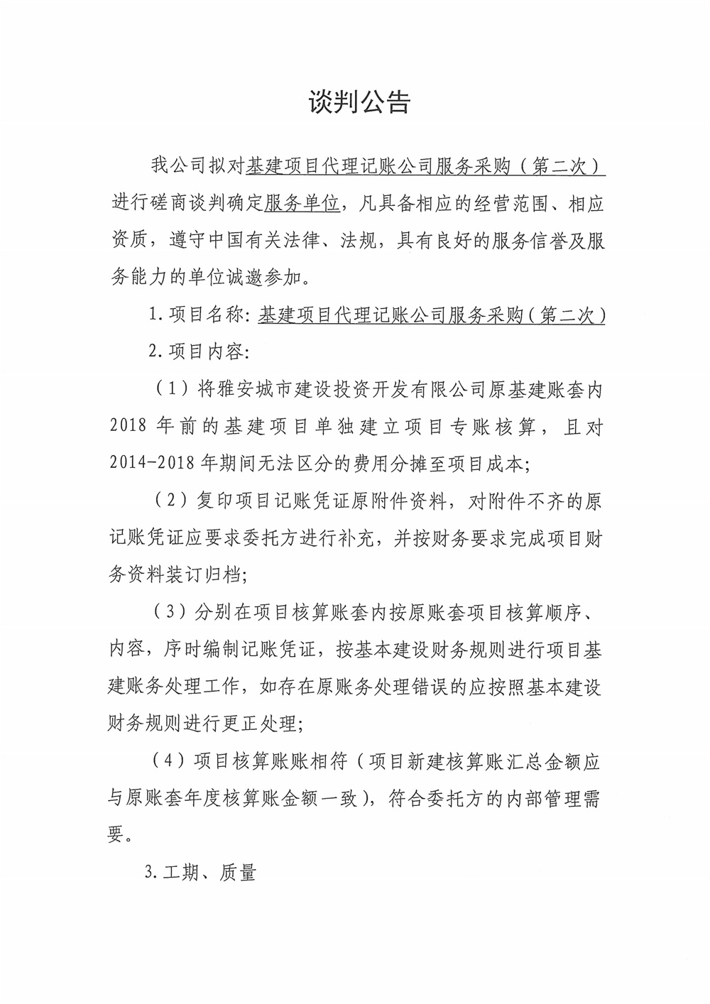 城投公司基建項目代理記賬公司服務采購磋商談判公告(第二次)