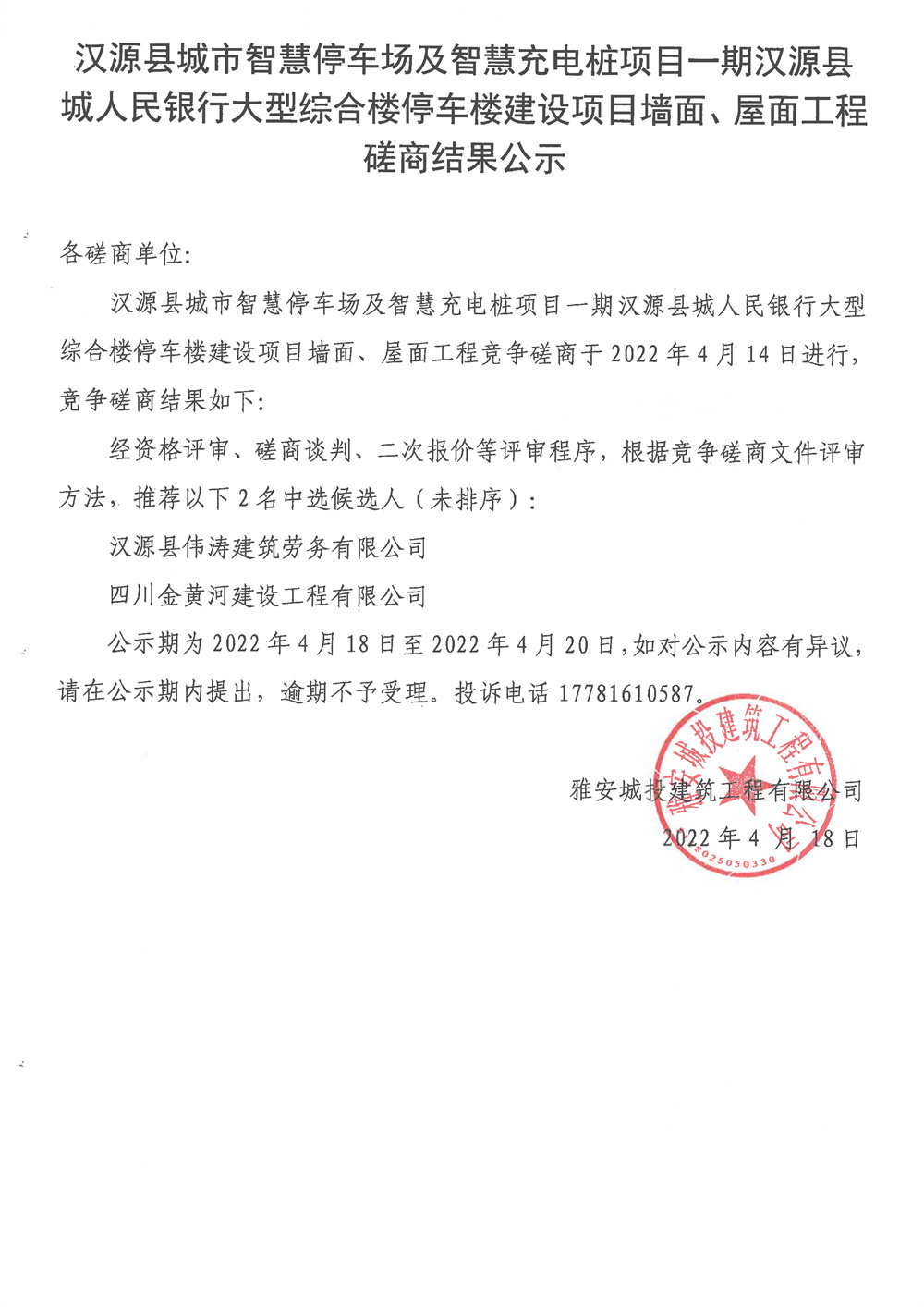城投建工漢源縣城市智慧停車場(chǎng)及智慧充電樁項(xiàng)目一期漢源縣城人民銀行大型綜合樓停車樓建設(shè)項(xiàng)目墻面、屋面工程競(jìng)爭(zhēng)磋商結(jié)果公示