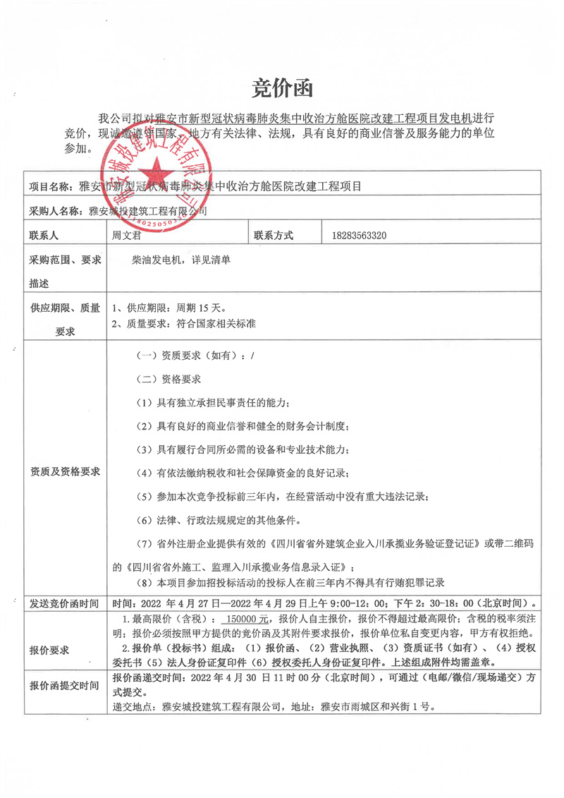 雅安市新型冠狀病毒肺炎集中收治方艙醫(yī)院改建工程項(xiàng)目發(fā)電機(jī)競價函