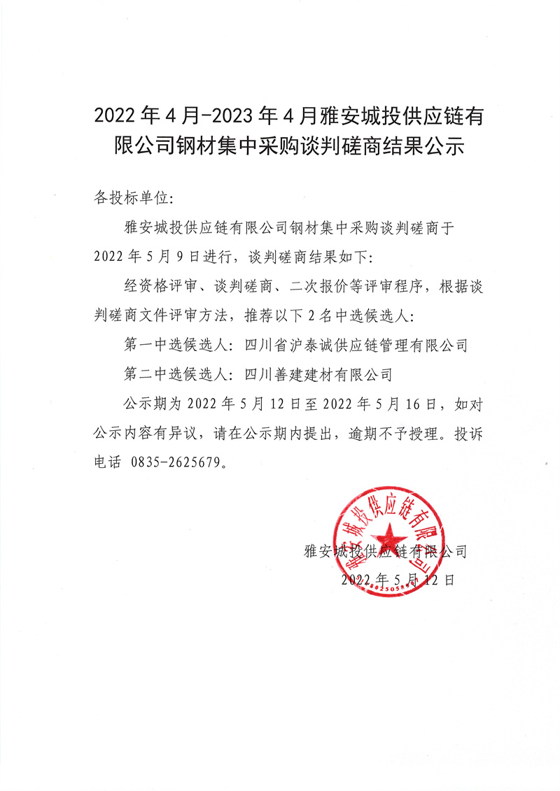 2022年4月-2023年4月雅安城投供應鏈有限公司鋼材集中采購談判磋商結果公示