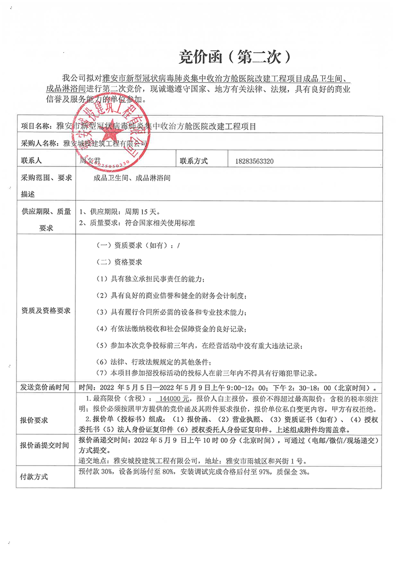 雅安市新型冠狀病毒肺炎集中收治方艙醫(yī)院改建工程項(xiàng)目成品衛(wèi)生間、淋浴間采購競價(jià)函(第二次)
