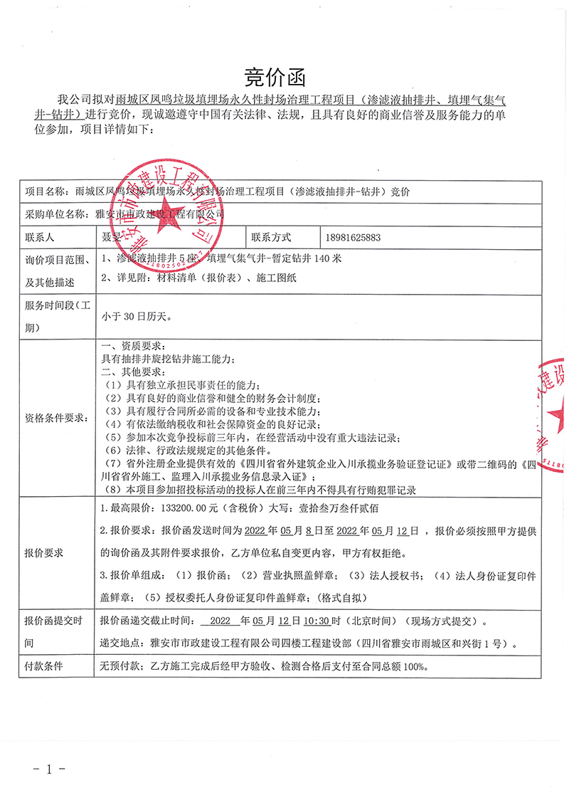 雨城區(qū)鳳鳴垃圾填埋場永久性封場治理工程項目(滲濾液抽排井、填埋氣集氣井鉆井)競價公告
