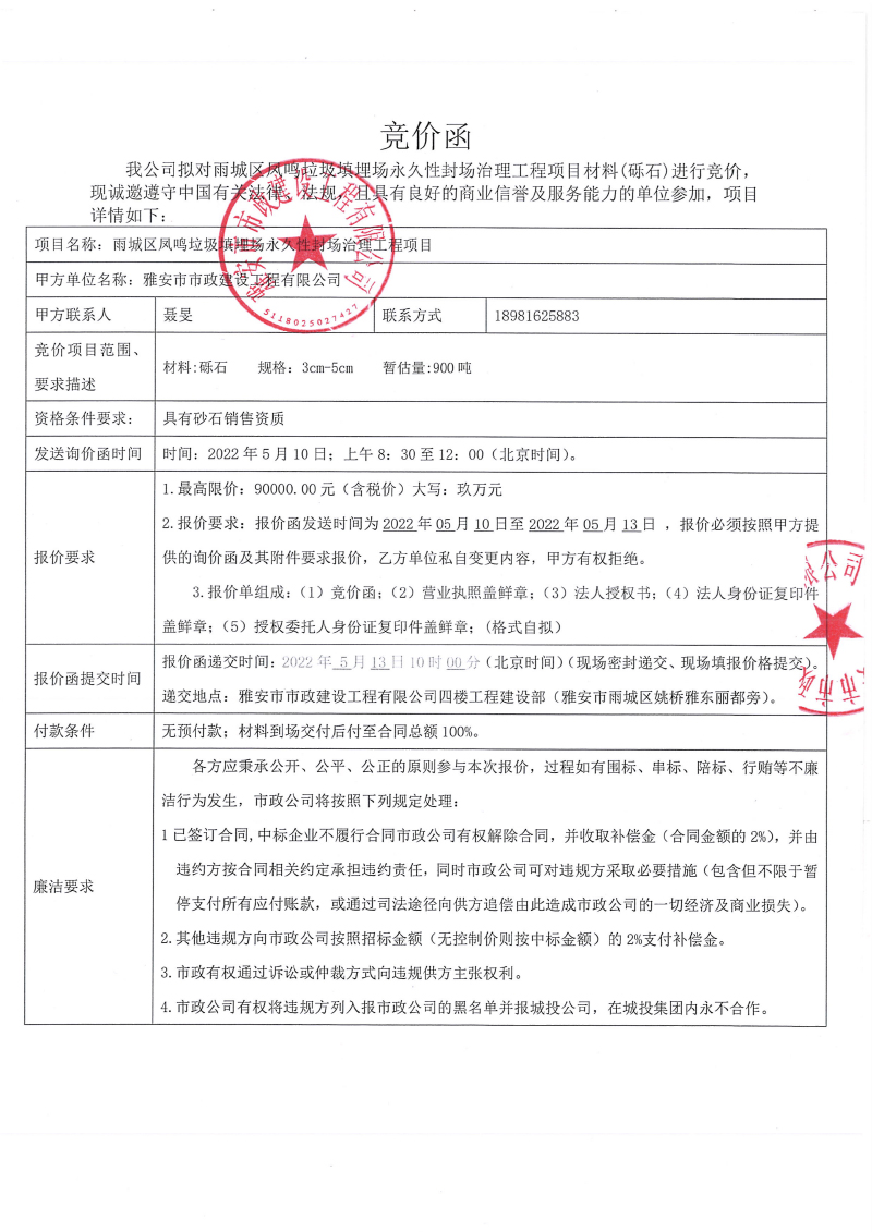 雨城區(qū)鳳鳴垃圾填埋場(chǎng)永久性封場(chǎng)治理工程項(xiàng)目材料(礫石)競(jìng)價(jià)公告