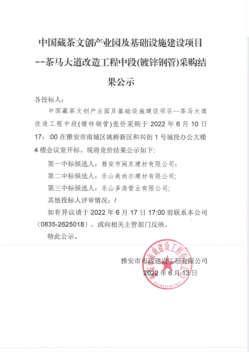 中國藏茶文創(chuàng)產(chǎn)業(yè)園及基礎(chǔ)設(shè)施建設(shè)項(xiàng) 茶馬大道改造工程中段鍍鋅鋼管采購結(jié)果公示