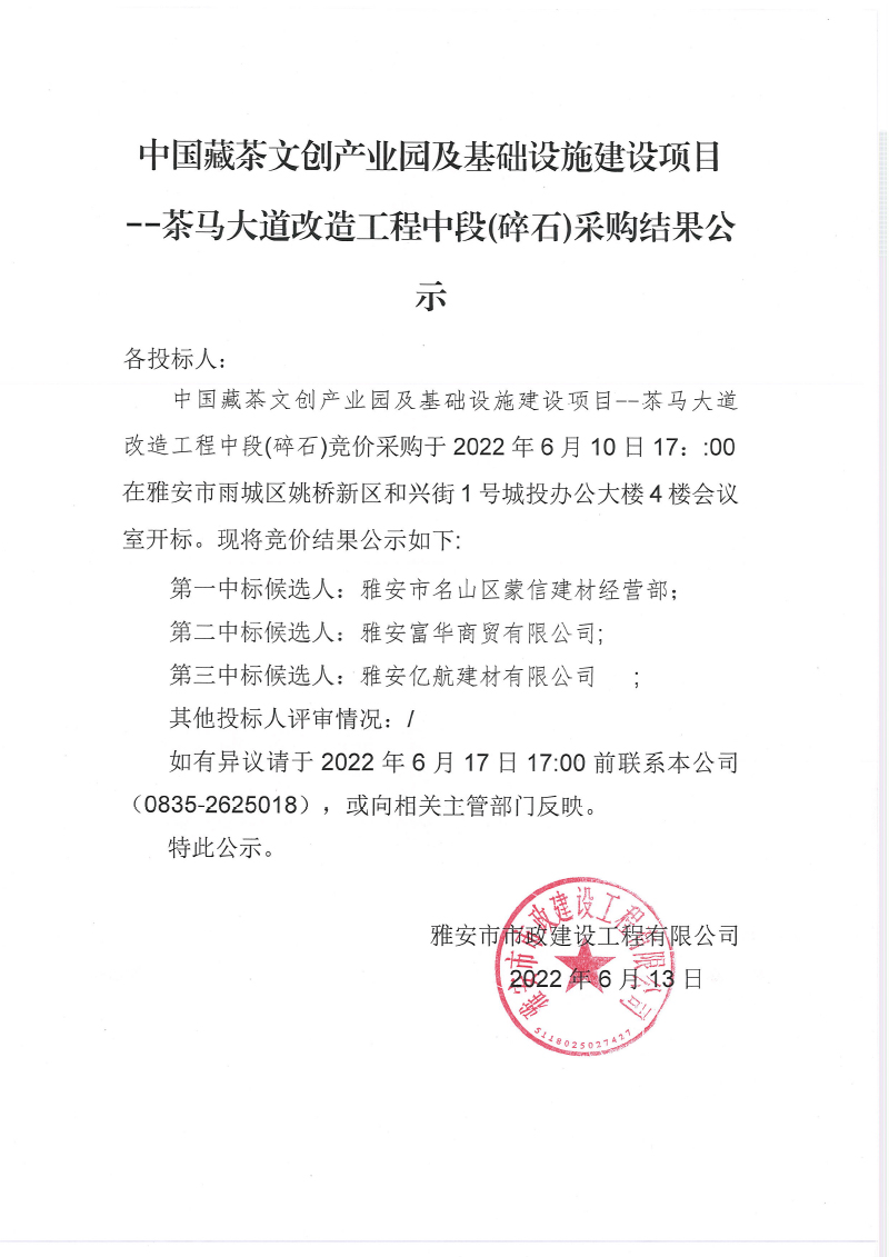 中國藏茶文創(chuàng)產業(yè)園及基礎設施建設項 茶馬大道改造工程中段碎石采購結果公示