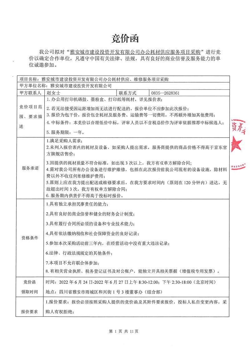 雅安城市建設(shè)投資開(kāi)發(fā)有限公司 辦公耗材供應(yīng)、維修服務(wù)項(xiàng)目采購(gòu)競(jìng)價(jià)公告