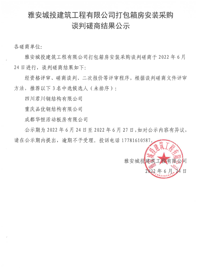 雅安城投建筑工程有限公司打包箱房安裝采購談判磋商結果公示