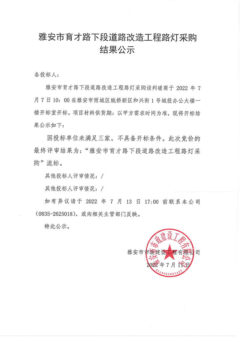 雅安市育才路下段道路改造工程路燈采購競價結果公示