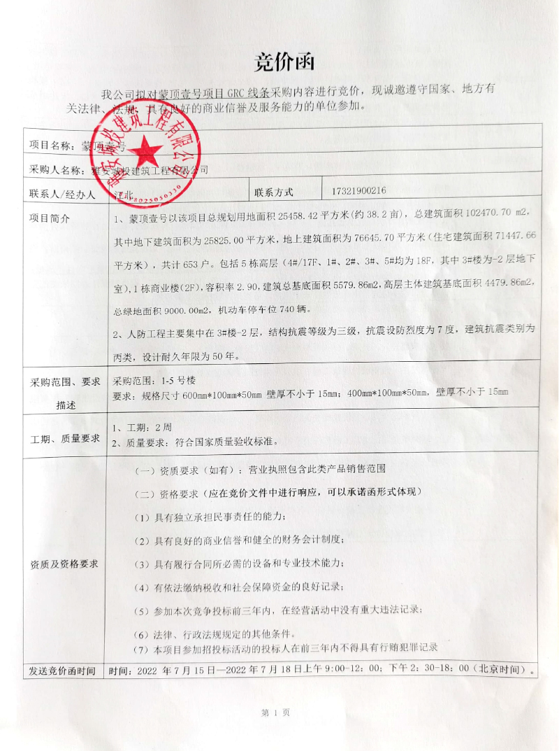 蒙頂壹號項目GRC線條采購競爭公告