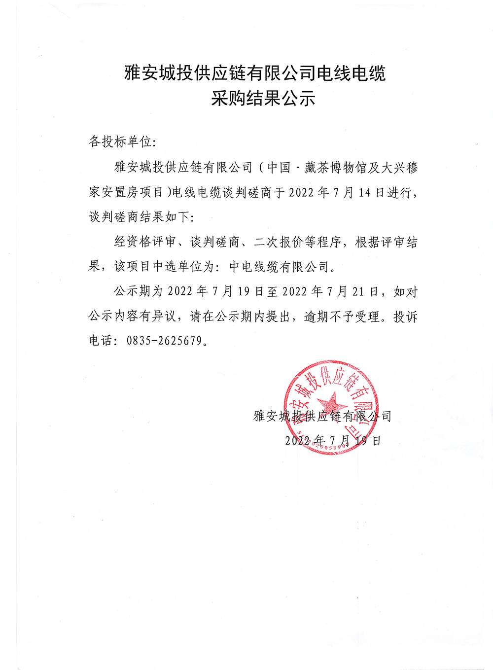 雅安城投供應鏈有限公司電線電纜采購結果公示