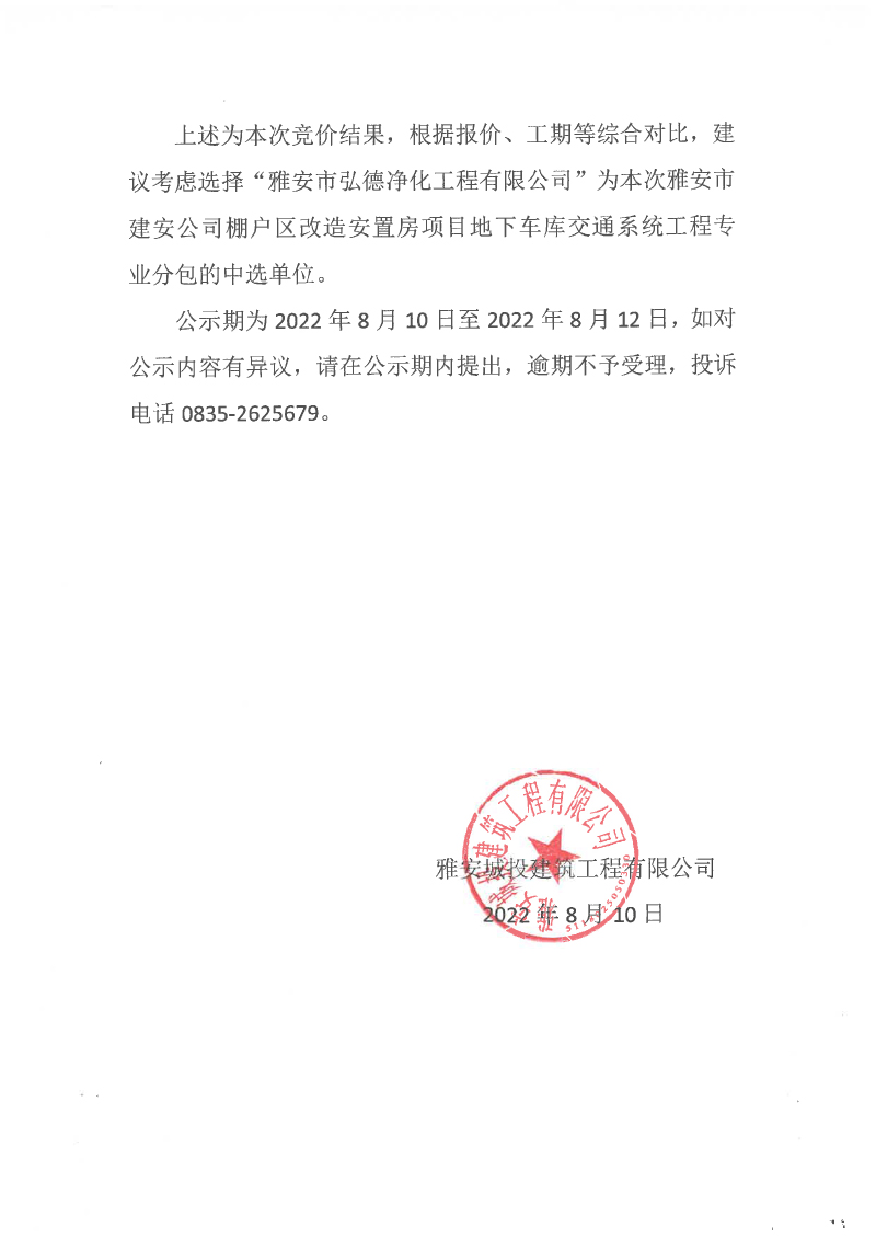雅安市建安公司棚戶區(qū)改造安置房項目地下車庫交通系統(tǒng)工程專業(yè)分包競價結(jié)果公示