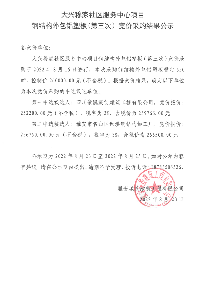 大興穆家社區(qū)服務中心項目鋼結構外包鋁塑板(第三次)競價采購結果公示