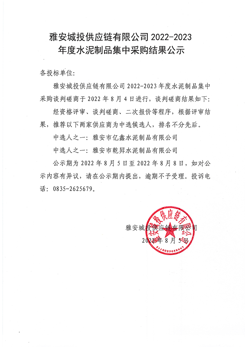 雅安城投供應(yīng)鏈有限公司2022-2023年度水泥制品集中采購(gòu)結(jié)果公示