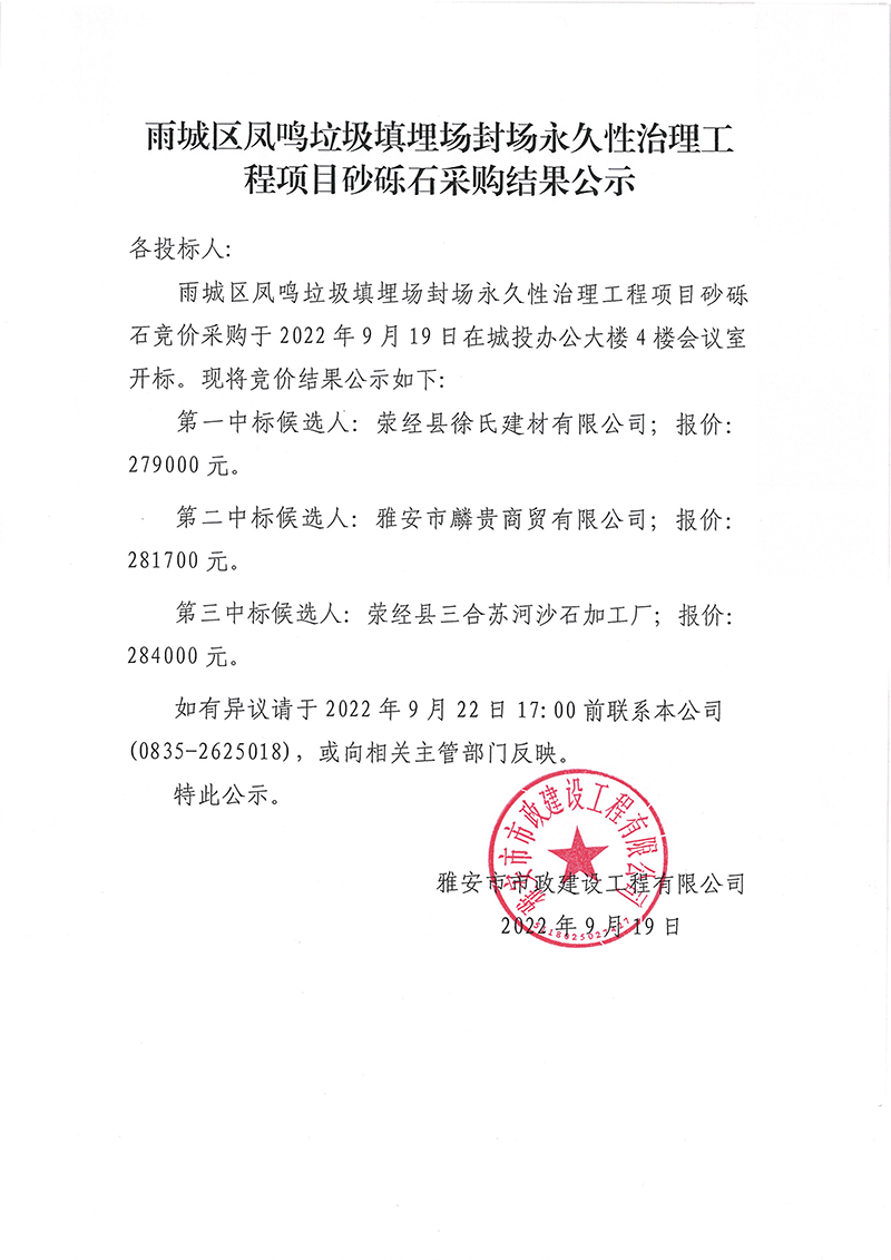 雨城區(qū)鳳鳴垃圾填埋場永久性封場治理工程項目砂礫石采購結果公示