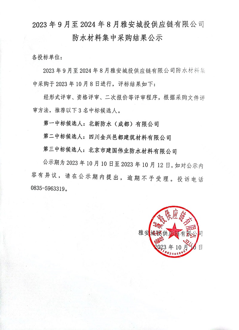 2023年9月至2024年8月雅安城投供應鏈有限公司防水材料集中采購結果公示