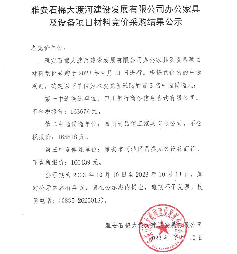 雅安石棉大渡河建設發(fā)展有限公司辦公家具及設備項目材料競價采購結果公示