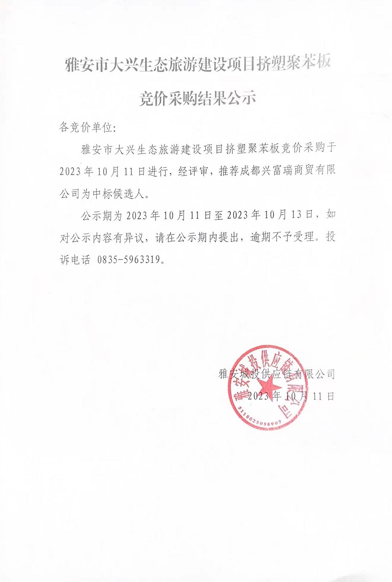 雅安市大興生態(tài)旅游建設(shè)項(xiàng)目擠塑聚苯板競價采購結(jié)果公示