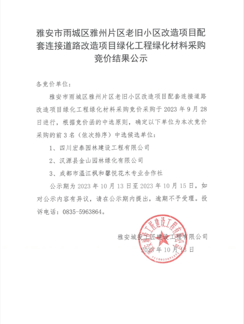 雅安市雨城區(qū)雅州片區(qū)老舊小區(qū)改造項(xiàng)目配套連接道路改造項(xiàng)目綠化工程綠化材料采購競價(jià)結(jié)果公示