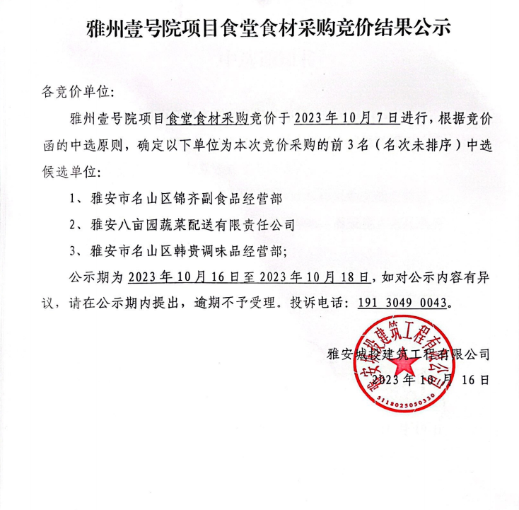 雅州壹號(hào)院項(xiàng)目食堂食材采購競價(jià)結(jié)果公示